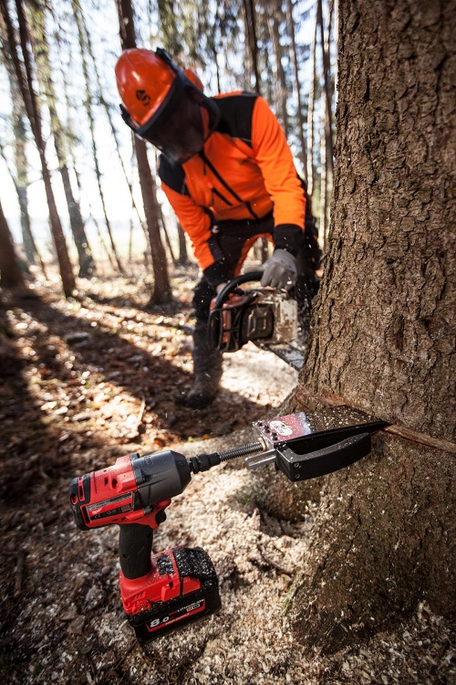 Das bedeutet, die halbe Spindel ist geschützt im Fällkeil, und nur die zweite Hälfte der Spindel ist freiliegend.
