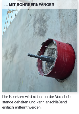 - integrierte Bohrkernfangeinrichtung, Bohrkern verbleibt zuverlässig an der Vorschubstange und kann einfach entfernt werden