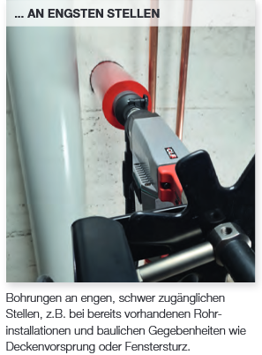 - Bohrungen an engen, schwer zugänglichen Stellen, z.B. bei bereits vorhandenen Rohrinstallationen und baulichen Gegebenheiten wie Deckenvorsprung oder Fenstersturz