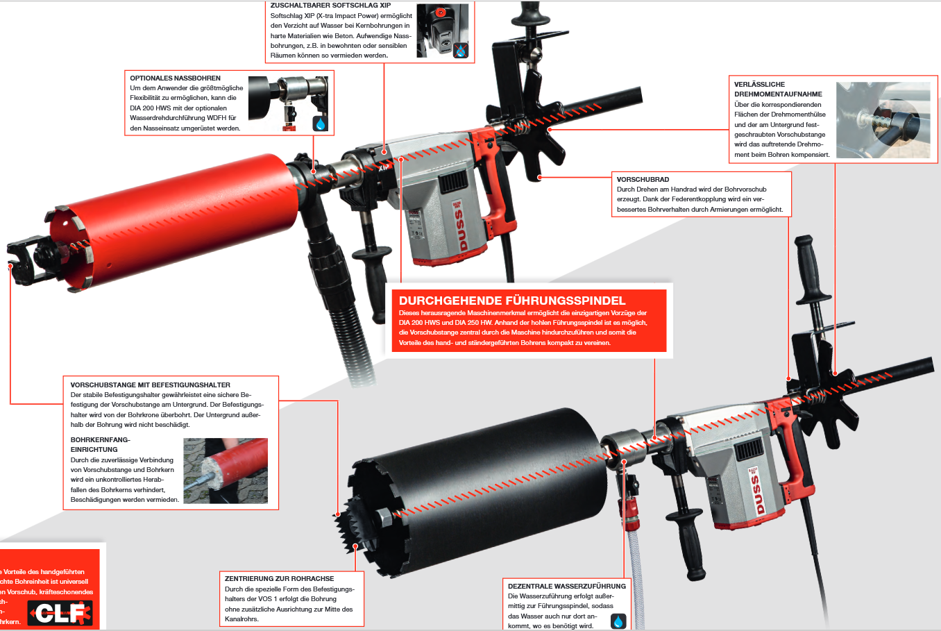 - montierbares Vorschubsystem CLF für unkomplizierte, ermüdungsfreie Bohrungen, das die Vorteile des hand- und ständergeführten Bohrens kombiniert