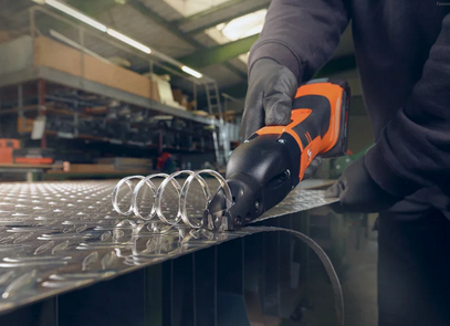 - 180 m Schneidkapazität (in 0,8 mm Blech) mit einer Akku-Ladung (GBA 5 Ah).