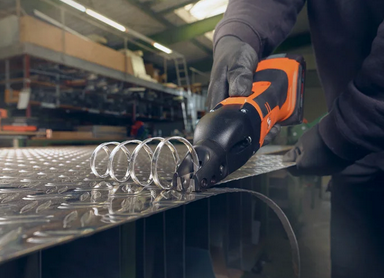 - 180 m Schneidkapazität (in 0,8 mm Blech) mit einer Akku-Ladung (GBA 5 Ah).