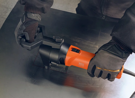 - Durch eine hohe Kurvengängigkeit kann die Maschine auf einer Position gedreht werden. Dadurch ist sie bestens geeignet für Aussparungen und Ausschnitte z.B. Schablonen in Blech.