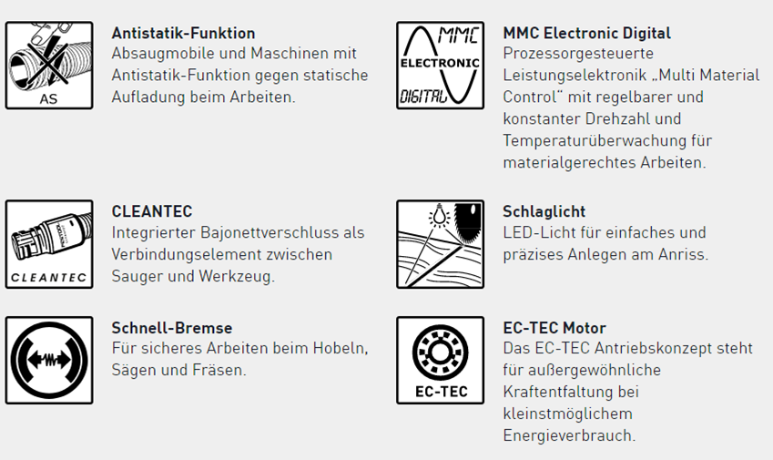 Exzellente Ergebnisse erzielt ihr besser und gesünder im perfekt abgestimmten System. Besser: Mit Sägeblättern für jede Anwendung - dank Drehzahlvorwahl mit 100%ig materialgerechter Geschwindigkeit – sowie einer Winkelschmiege zur direkten Übernahme von Innen- und Außenwinkeln. Gesünder: Das rollbare Untergestell für eine ergonomische Arbeitshaltung und einfachen Transport sowie Staubfangbeutel für staubarmes Arbeiten. Einfach praktisch: Mit einem Energiepaket aus Akkupacks + Ladegerät, sauber aufgeräumt im Systainer³.