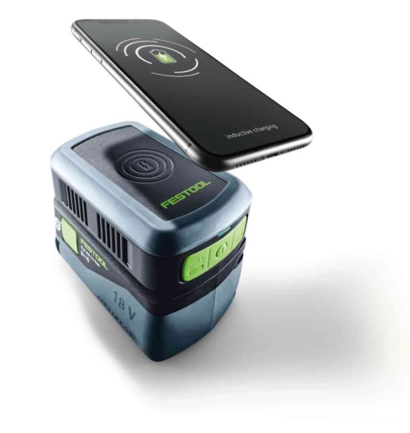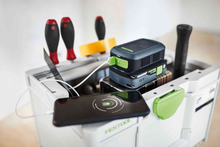 Macht unabhängig: In Kombination mit einem aufgeladenen Festool 18 V Akkupack lädt das Handy auch dann, wenn keine Steckdose in der Nähe ist