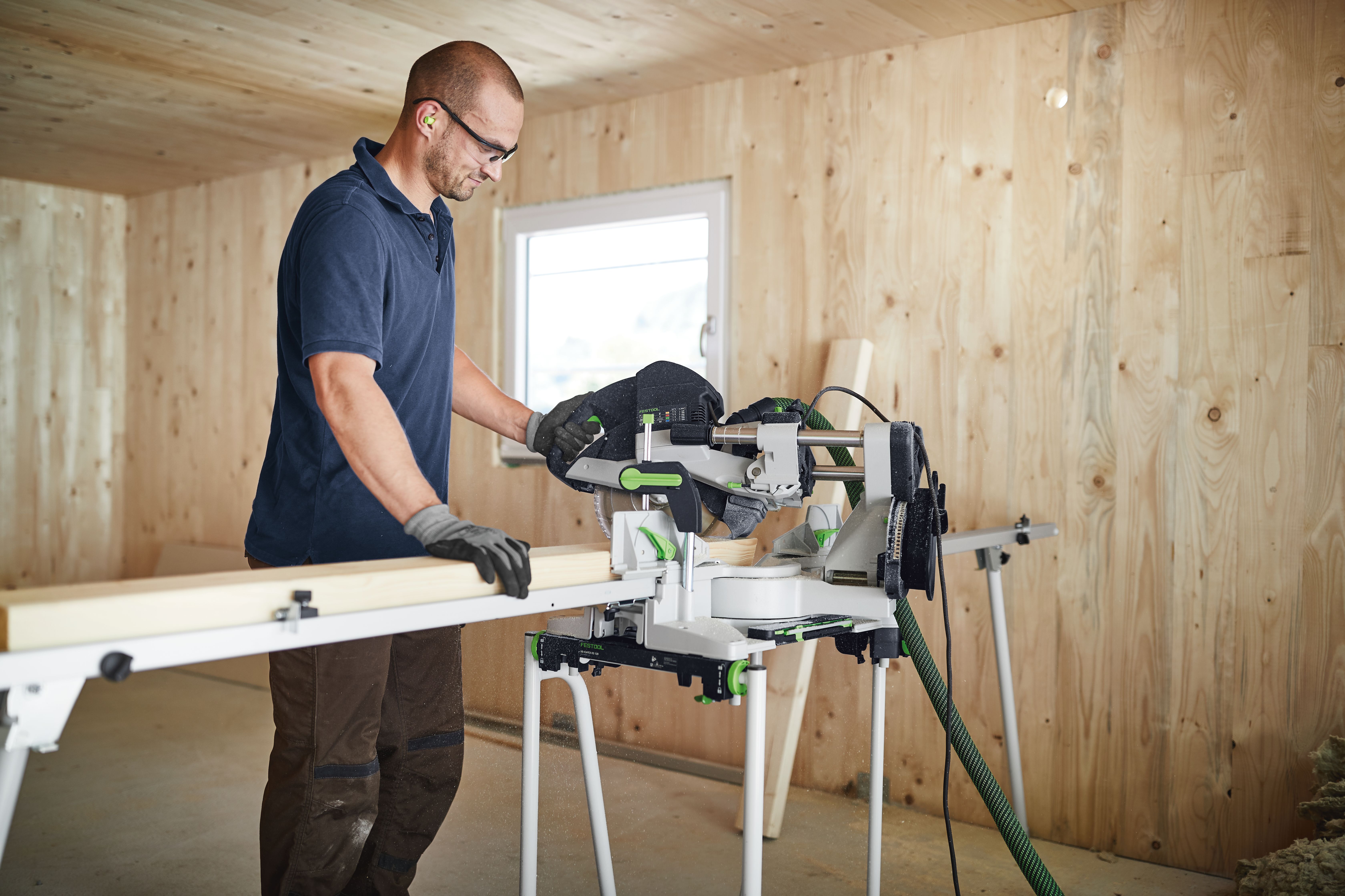 - Mit der integrierten Sonder-Kappstellung können Leisten bis zu 120 mm senkrecht am Anschlag gesägt werden