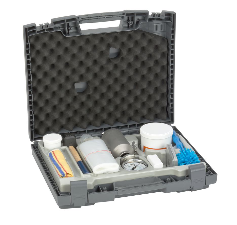 Das Kofferset CM-B-Pro enthält Messgeräte zur Bestimmung der Feuchtigkeit in abgebundenen Baustoffen und diversen anderen Materialien nach der Calcium-Carbid-Methode.