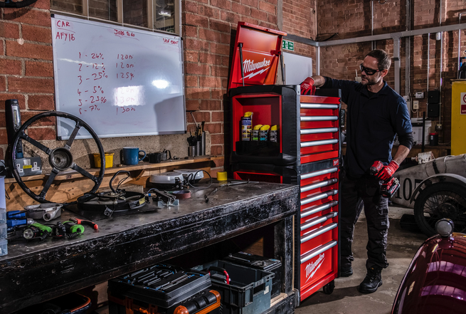 - Magnetischer 240-Volt-Elektroverteiler ermöglicht das Laden von Akkus direkt am Werkstattwagen.