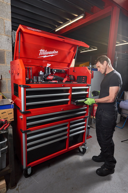 - Magnetischer 240-Volt-Elektroverteiler ermöglicht das Laden von Akkus direkt am Werkstattwagen.