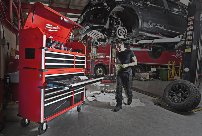 - Magnetischer 240-Volt-Elektroverteiler ermöglicht das Laden von Akkus direkt am Werkstattwagen-Aufsatz.